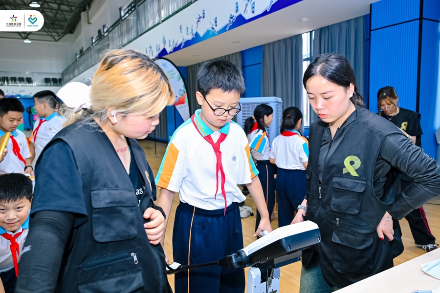 本次活动还向学校捐赠了旱地冰壶、匹克球、弹射对接球等一批体育器材,进一步丰富了校园体育活动资源。在为期两天的活动中,全体六年级共200余名学生将参与脊柱侧弯检测、脊柱曲度检测、足底压力检测、体态评估、体成分测试等多项体质监测。此外,飞盘九宫格、超级大乐“投”、幸运圈圈乐、“乒”出精“彩”等趣味运动打卡项目也吸引了同学们踊跃参与,完成所有项目的学生将获得体彩乐小星解压本、玩偶等精美礼品,在运动中收获快乐与成就感。